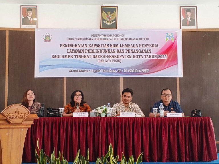TOMOHON, – Dinas Pemberdayaan Perempuan dan Perlindungan Anak (DP3A) Daerah Kota Tomohon menggelar kegiatan Peningkatan Kapasitas SDM Lembaga Penyedia Layanan Perlindungan dan Penanganan Anak dan Perempuan Korban (AMPK) Tingkat Daerah Kabupaten/Kota, yang berlangsung di Grand Master Villa Tomohon, Jumat (10/10/2025).