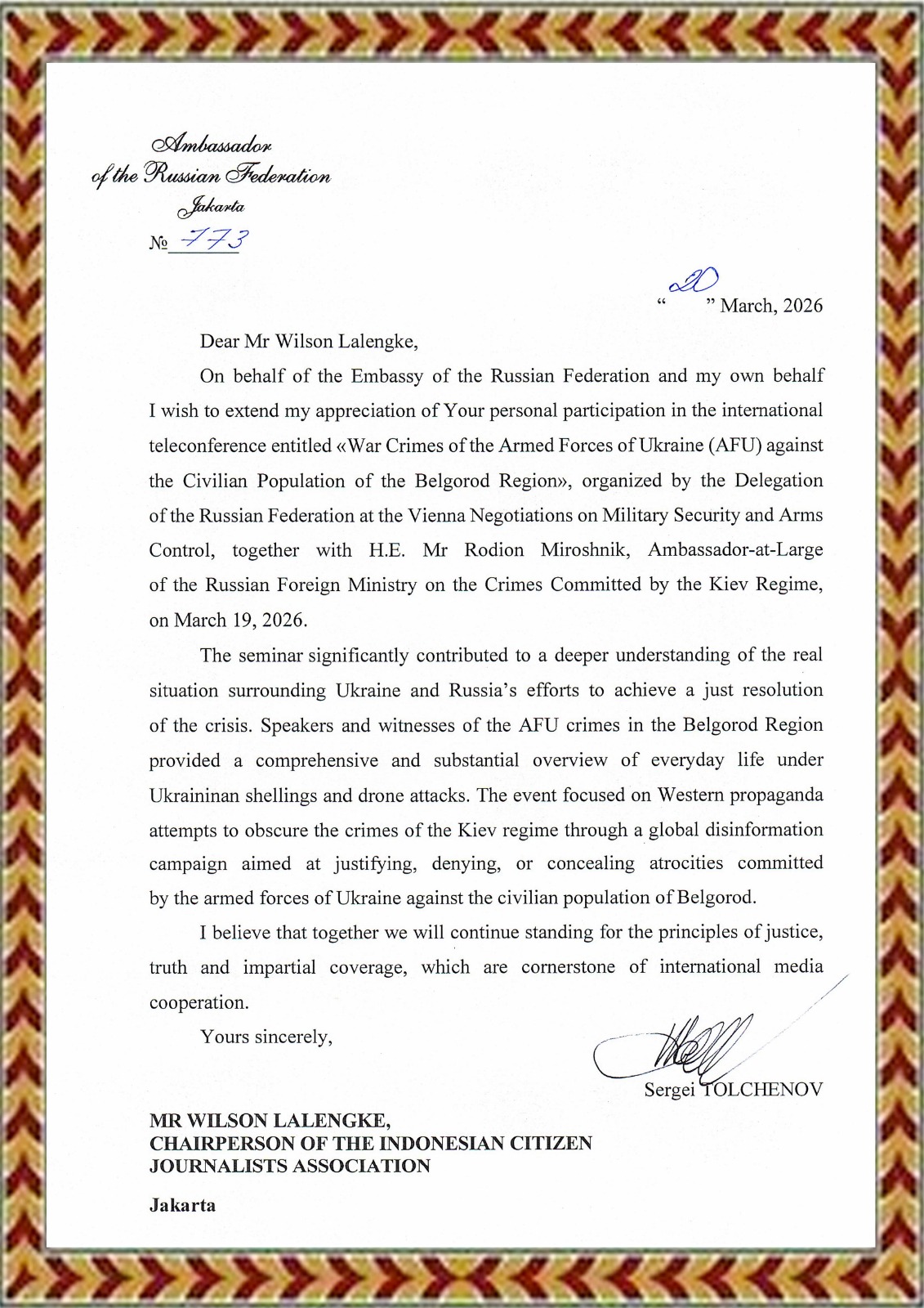 JAKARTA – Apresiasi datang dari Sergei Tolchenov kepada Persatuan Pewarta Warga Indonesia atas partisipasi aktif dalam forum internasional yang membahas konflik Rusia–Ukraina. Ucapan terima kasih tersebut disampaikan secara resmi melalui surat kepada jajaran pengurus dan anggota PPWI di seluruh Indonesia.