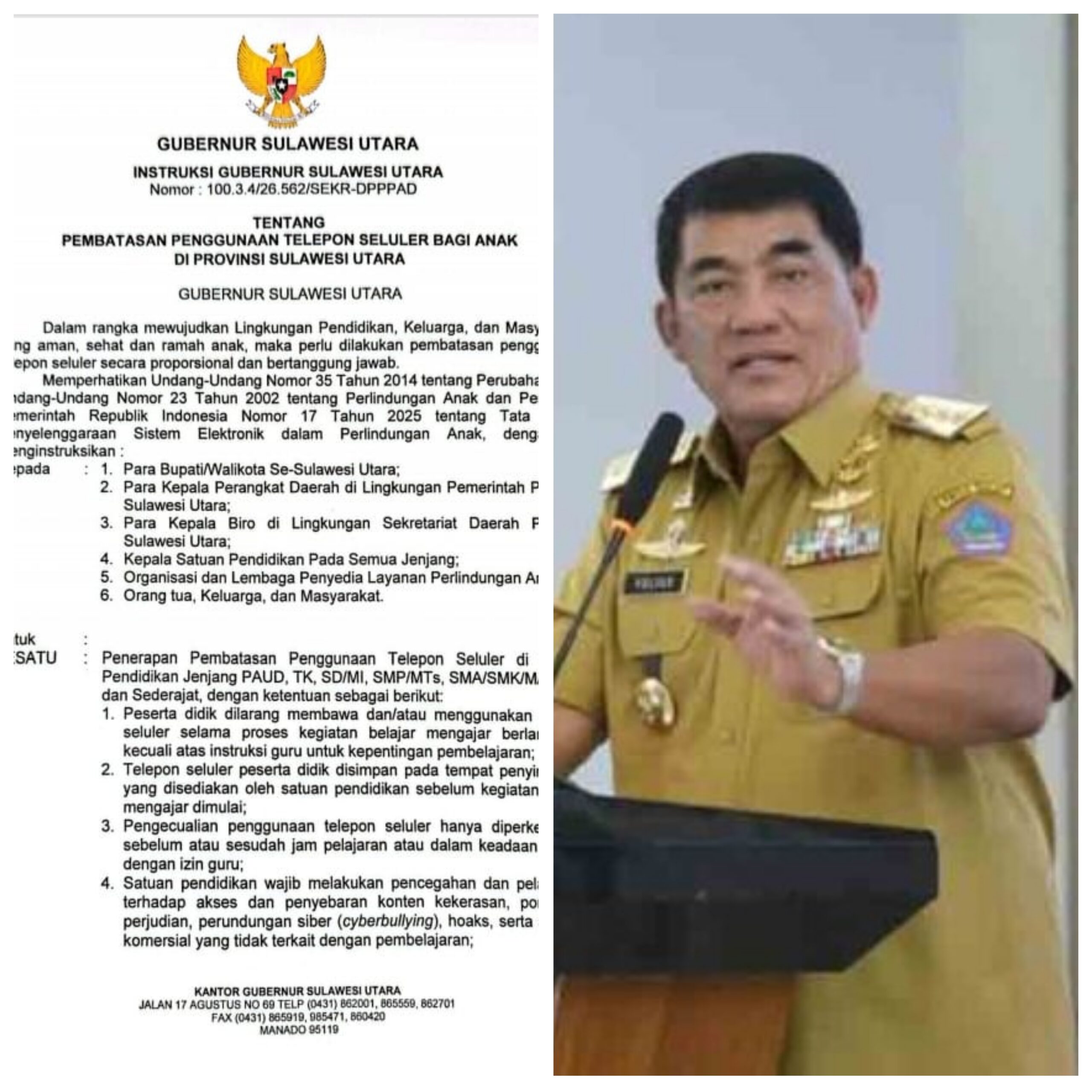 MANADO — Gubernur Sulawesi Utara Yulius Selvanus menerbitkan Instruksi Gubernur Sulawesi Utara Nomor 100.3.4/26.562/SEKR-DPPPAD tentang pembatasan penggunaan telepon seluler bagi anak di lingkungan satuan pendidikan di Provinsi Sulawesi Utara.