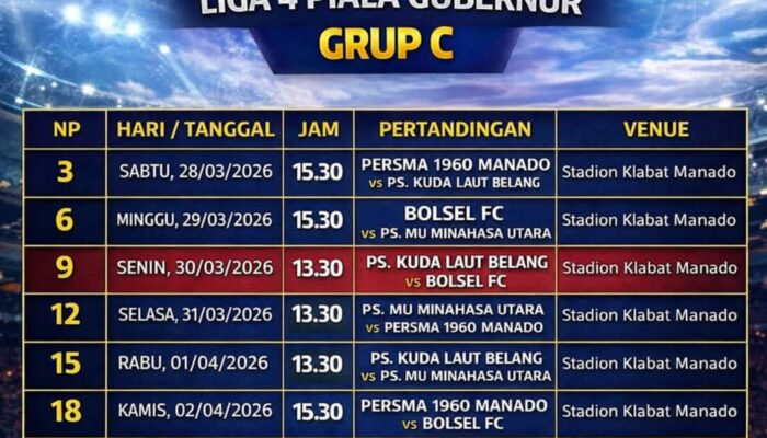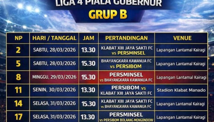 MANADO — Penyelenggaraan Liga 4 Piala Gubernur Sulawesi Utara 2026 resmi dimulai, ditandai dengan dirilisnya jadwal lengkap pertandingan yang akan berlangsung mulai 28 Maret hingga awal April 2026.