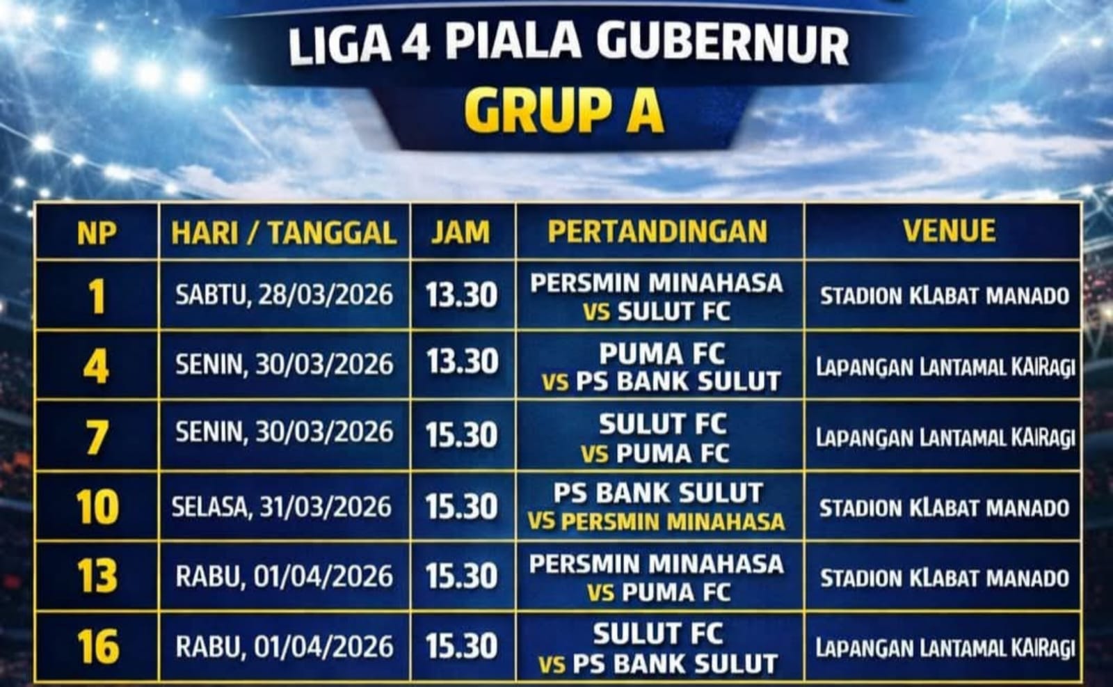 Dengan jadwal yang telah ditetapkan, masyarakat pecinta sepak bola di daerah diharapkan dapat memberikan dukungan penuh kepada tim-tim yang berlaga dalam perebutan Piala Gubernur Sulawesi Utara 2026. (*)
