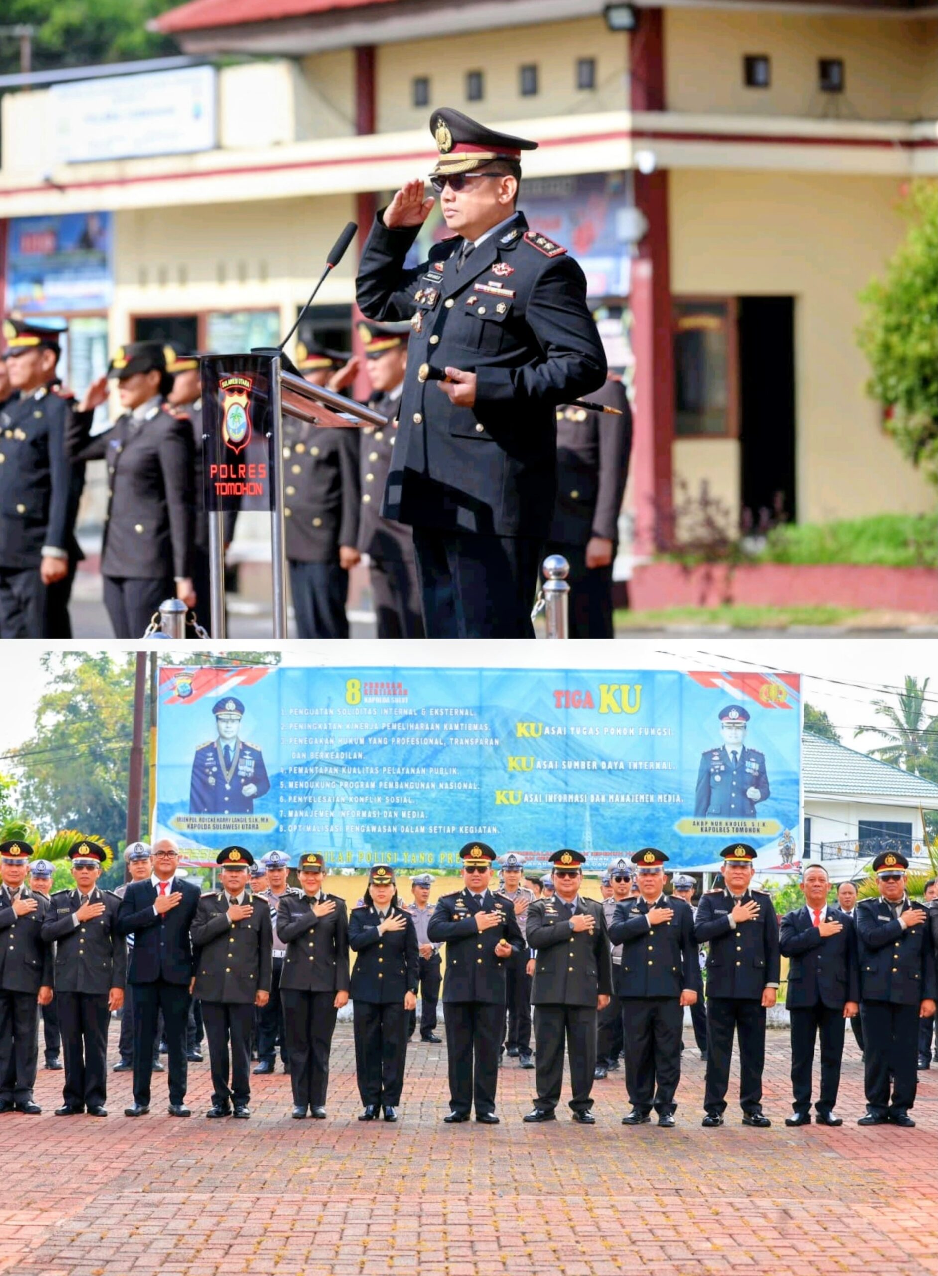 Upacara yang berlangsung khidmat ini dipimpin langsung oleh Kapolres Tomohon, AKBP Nur Kholis, S.I.K., selaku inspektur upacara. Hadir pula Wakapolres Tomohon, para pejabat utama, Kapolsek jajaran, perwira, brigadir, serta ASN Polri Polres Tomohon.