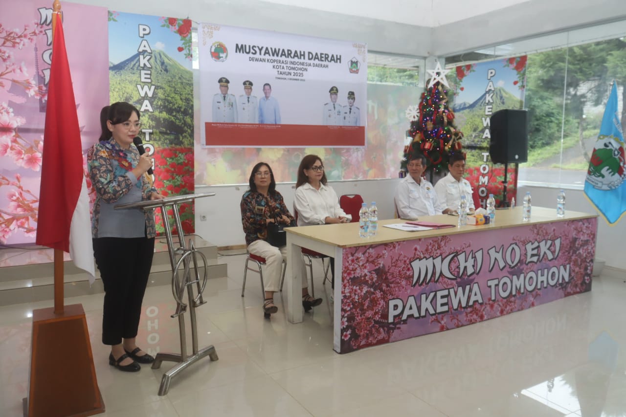 TOMOHON — Wakil Wali Kota Tomohon, Sendy G. A. Rumajar, SE, M.I.Kom menghadiri sekaligus membuka Musyawarah Daerah (Musda) Dewan Koperasi Indonesia Daerah (Dekopinda) Kota Tomohon Tahun 2025 yang digelar di Michi No Eki Pakewa Tomohon, Jumat (5/12/2025).
