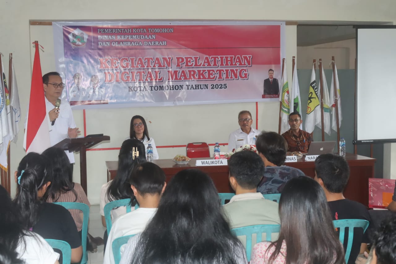 TOMOHON, — Wali Kota Tomohon Caroll J. A. Senduk, S.H. menghadiri sekaligus membuka Pelatihan Digital Marketing bagi Pemuda serta Peluncuran Platform Online UMKM Pemuda Kota Tomohon, yang dilaksanakan di ruang KONI Dikpora Tomohon, Rabu (26/11/2025).